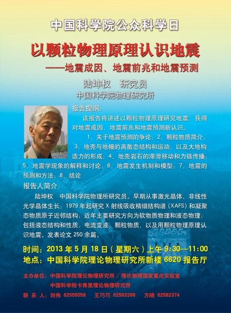 中国科学院理论物理所公众科学日-科普报告“以颗粒物理原理认识地震---地震成因、地震前兆和地震预测”