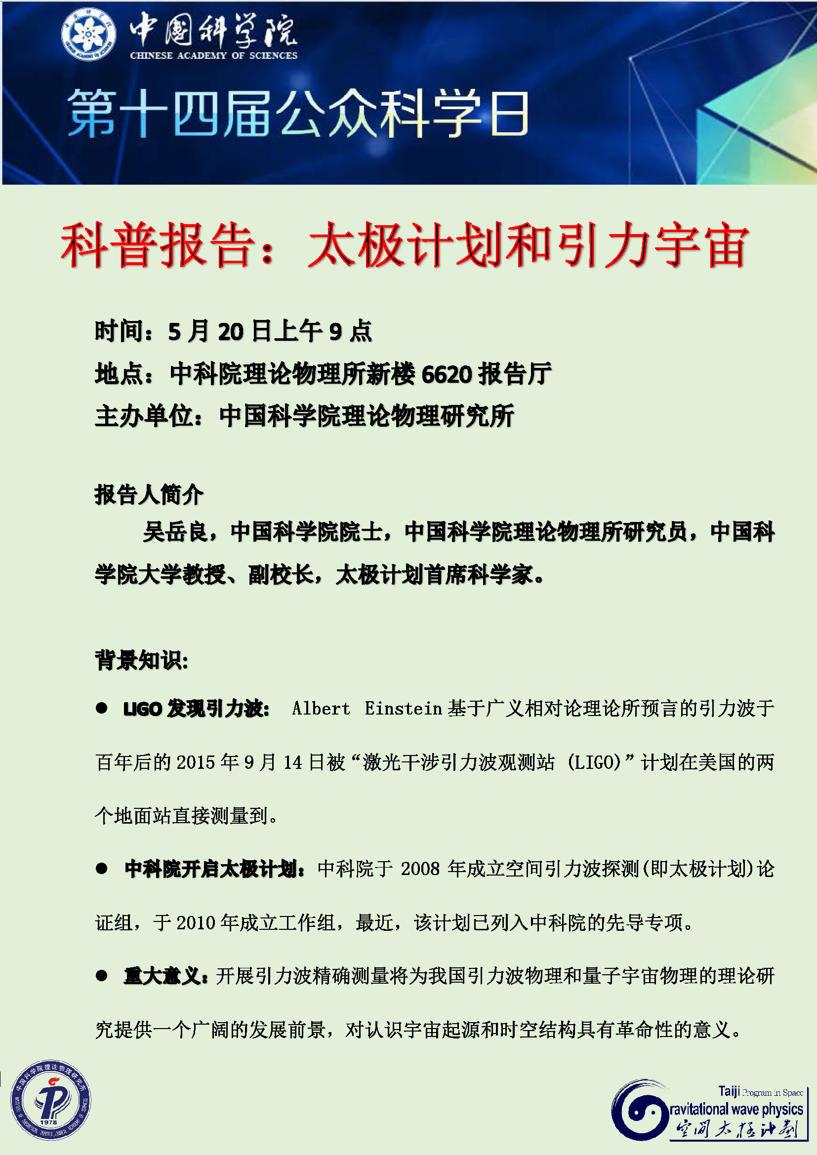 中国科学院第14届公众科学日——太极计划和引力宇宙