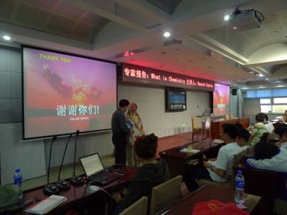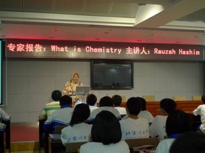 报告中Hashim教授从古代炼金术开始,系统的向同学们介绍了古代和现代化学的区别和联系、化学和化学家的演变过程等科普知识。随后Hashim教授以自身为例介绍了学习化学的目的,并向同学们提出了“为什么要学习化学?”的问题:第一,学习化学有助于理解一些基本的物理模型;第二,可以从不同视角去理解现今的事物;第三,可以提高解决问题能力;第四,对生命意义有所理解。化学是一门中心科学,它与环境科学、地球科学、工程学、物理学、生物学、制药学等多领域息息相关,它也是一种挑战。Hashim教授讲到现代化学涉及的领域与物理研究很紧密,热力学四个定律、量子理论、统计理论即为其中十分具有代表性的重要内容。她生动的向同学们介绍了四个定律的含义与实际应用。
