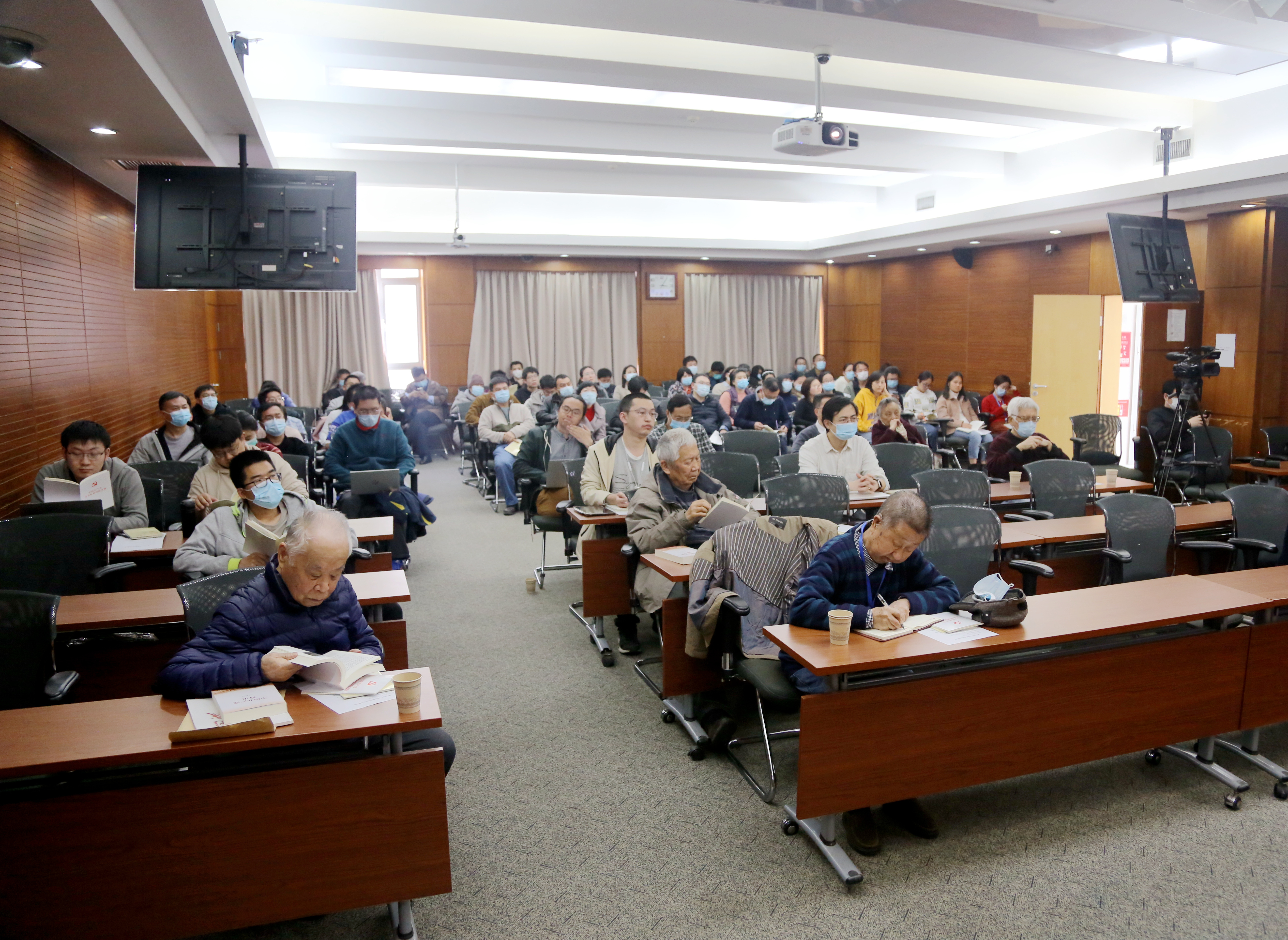 3月24日下午,理论物理所党委召开党史学习教育推进动员会,所长、党委书记蔡荣根领学了习近平总书记在党史学习教育动员大会上的讲话精神、中央关于开展党史学习教育的通知精神,传达了院党组党史学习教育实施方案,对所党委党史学习教育活动计划进行了部署。何祚庥院士、苏肇冰院士、张肇西院士、研究所党员、职工、博士后、研究生以及部分离退休老党员60余人参加了动员会。
