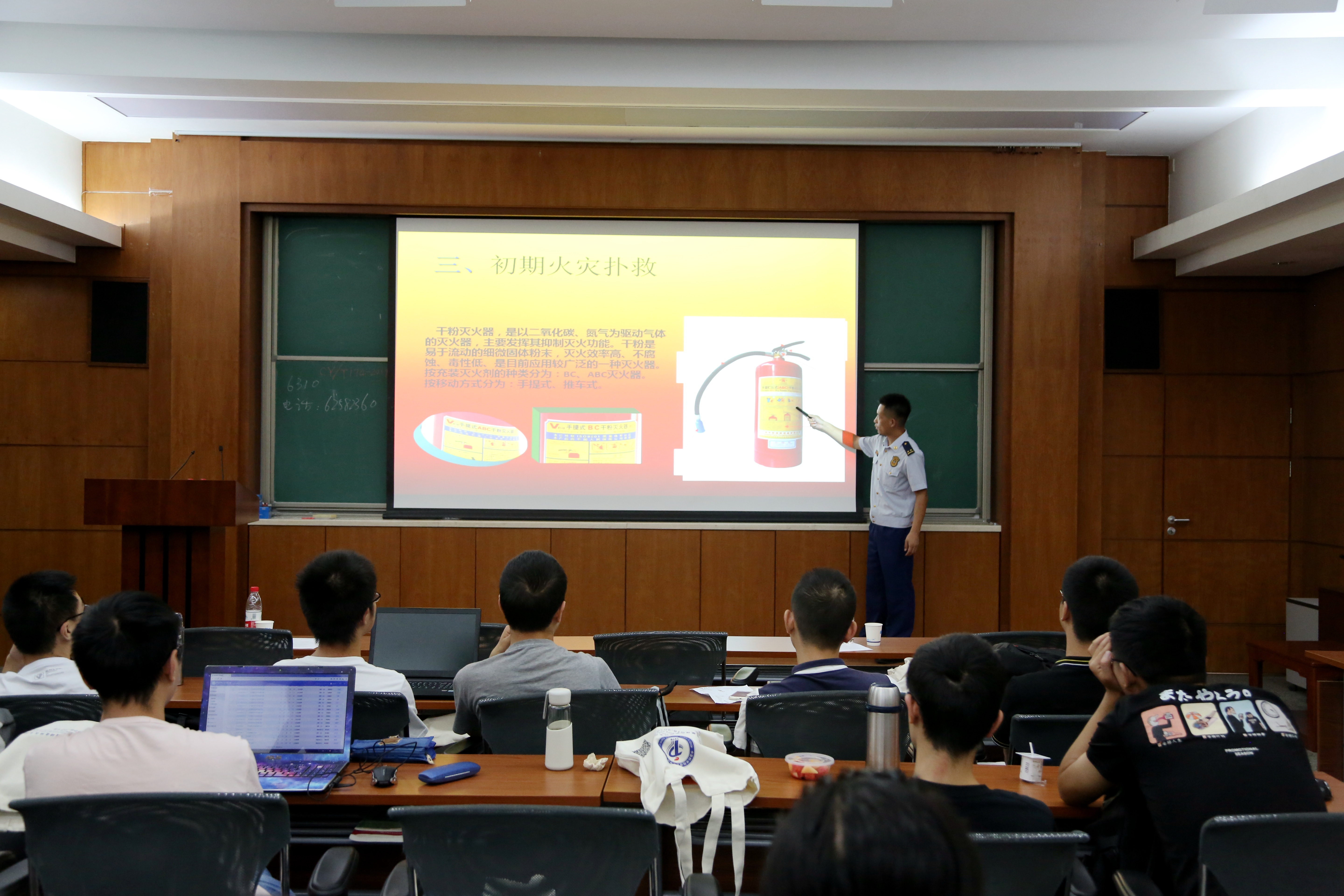 马队长就火灾的报警常识、疏散逃生的基本常识、火灾的预防与应急处置、灭火器材的使用等进行了讲解。他结合近年来发生的火灾事故,介绍了电器使用不当、消防通道物品堆积等引发的危害以及日常生活中需要注意的消防安全细节,并对火灾自救和逃生知识做了讲解。最后,马队长通过视频中的实验,展示了热得快和插线板等电器错误使用等行为造成的消防安全隐患,使大家有了更直观感受。