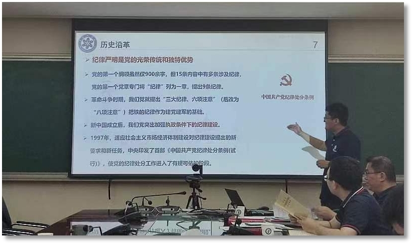 随后,毕研晨同志对《中国共产党纪律处分条例》进行了导学。他从为什么要学《中国共产党纪律处分条例》,该条例的历史沿革、基本框架以及党的监督执纪“四种形态”等方面进行了详细讲解。他认为,要想跳出治乱兴衰的历史周期律,除了毛泽东同志提出的“让人民监督政府”以外,还必须不断推进党的自我革命,将纪律建设推向纵深。