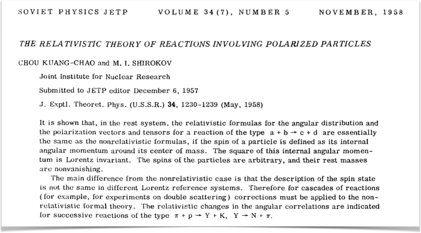 周光召先生从1957年春开始在杜布纳联合核子研究所工作,在这一时期,周光召先生开始相对性粒子自旋态方面的研究[1,2]。这一研究起源于莫斯科一场学术研讨会的讨论,周光召先生与一位莫斯科大学教授的意见相左,周先生并没有迷信权威,而是真正花三个月时间来思考这一问题。这个问题牵涉到量子场论一个非常基本的问题,什么是粒子?根据Wigner的理解[3],粒子是庞加莱群的不可约表示,一个粒子态可以用粒子的动量和自旋来描述。这个定义其实是有模糊性的,粒子的自旋取决于量子化轴的选取。在量子力学中,量子化轴的选取是固定轴,比如z轴,量子场论继承了这一选取,这叫做正则自旋。正则自旋的好处在于,在粒子的静止系中,粒子自旋态过渡到非相对论自旋,因此正则自旋很适合描述低能散射振幅。但是对于无质量粒子,由于不存在粒子静止系,正则自旋没有良好定义,这就是为什么需要提出螺旋度自旋。螺旋度自旋的好处在于,旋转变换下螺旋度不变,对于无质量粒子来说,boost之下也是不变的,这些性质非常好的描述了无质量粒子和高能极限下的粒子,因此非常适合高能相对论散射振幅。同时,对于有质量螺旋度,也是可以进行描述的,和正则自旋态之间可以通过Wigner D矩阵进行联系。