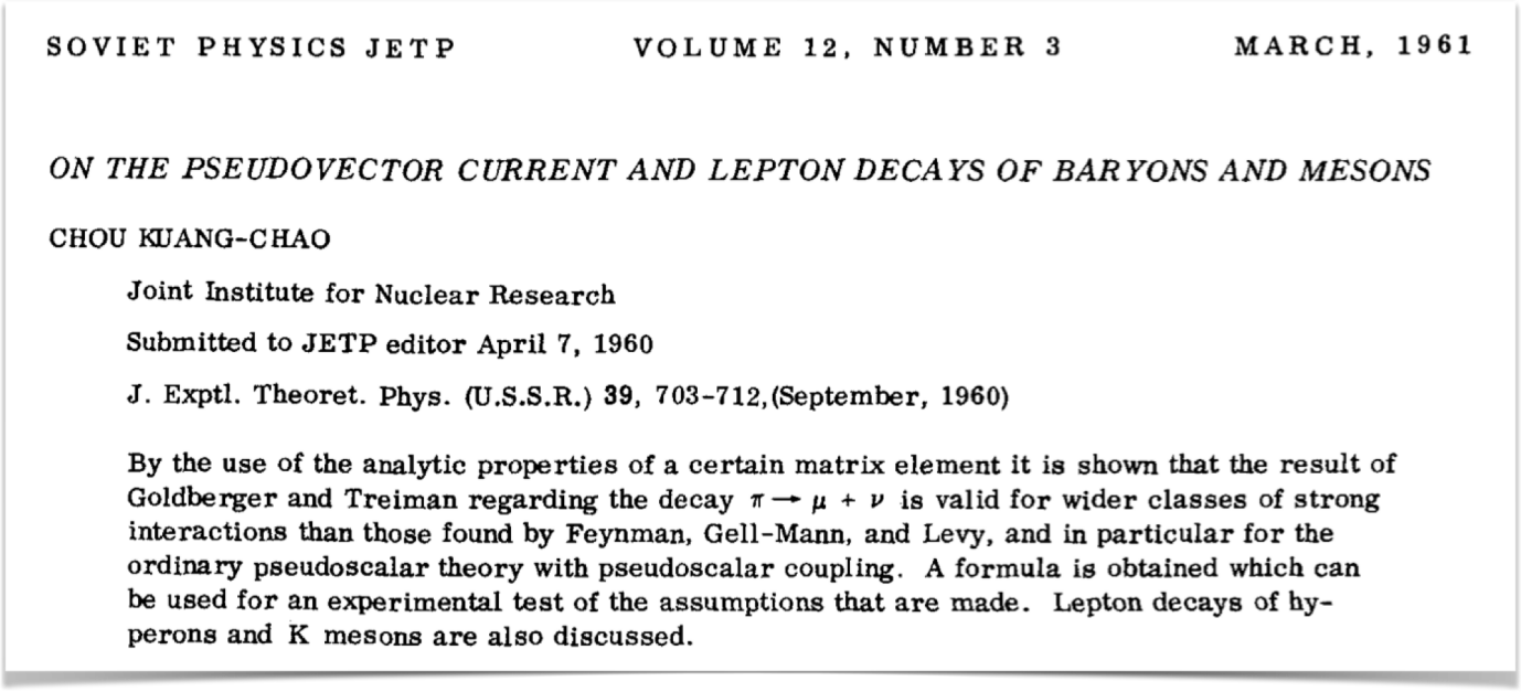 周光召先生真正有广泛影响的工作是他在杜布纳做出的赝矢量流部分守恒(PCAC)的工作,他在1961年JETP杂志上发表的工作推导出赝矢量流部分守恒定理[8],成为国际公认的PCAC的奠基者之一。这项工作的背景是源自1958年Goldberger-Treiman(GT)关系[9]:gA mN = gpiNN Fpi,其中mN是核子质量和Fpi是带电派介子衰变常数,这个关系在当时看来比较神奇,因为它联系了弱作用贝塔衰变的轴矢耦合常数gA(大约是1.27)以及强相互作用的pi-N-N耦合强度gpiNN(大约是13.4),和实验测量符合的很好,可是这个关系的理论解释是什么?根据现在的理解,轴矢量流的强子矩阵元,可以分解为两项贡献,轴矢量洛伦兹结构,和派介子pole主导的贡献,派介子在这里是无质量的赝标粒子。因为轴矢量流在无质量极限下守恒,这直接导致GT关系。当然我们知道派介子是有质量的,而且再加上反常的贡献,所以轴矢量流只是部分守恒的。