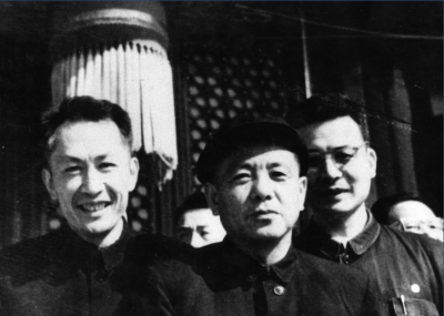 1966年国庆节,彭桓武与朱光亚(左)、邓稼先(右)在天安门城楼。