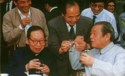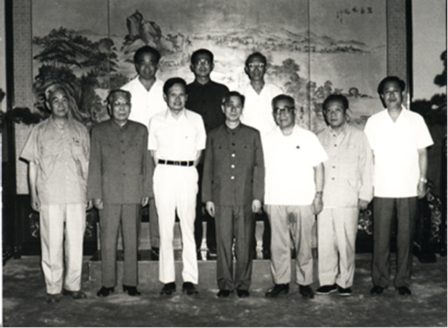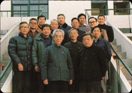 20世纪70年代末,彭桓武(前右二)与张文裕(前左一)、严济慈(前左二)、杨振宁(前左三)、中科院前院长方毅(前中)、卢嘉锡(前右三)。
