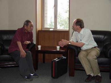 2004年8月,彭桓武与来访理论物理研究所的诺贝尔物理学奖获得者Gerardus 't Hooft交谈。