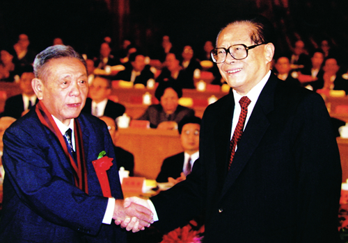1999年9月18日江泽民主席为理论物理所彭桓武院士颁发“两弹一星功勋奖章”