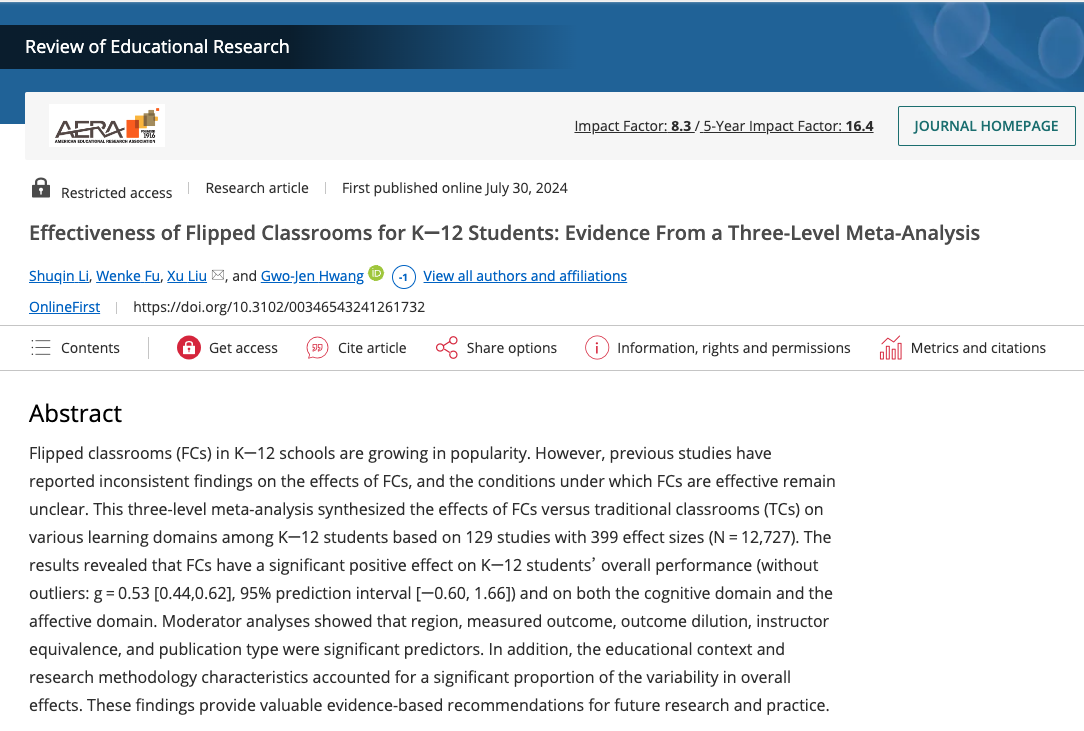 近日,我院刘旭教授研究团队取得重要学术成果。其论文“Effectiveness of flipped classrooms for K-12 students: Evidence from a three-level meta-analysis”在教育学国际顶级期刊Review of Educational Research发表。2021级课程与教学论专业博士生李书琴为第1作者,2021级课程与教学论专业硕士生符文可为第2作者,台中教育大学黄国祯教授为第3作者,刘旭教授担任本论文的通讯作者。湖南师范大学为论文的第一作者单位及通讯单位。