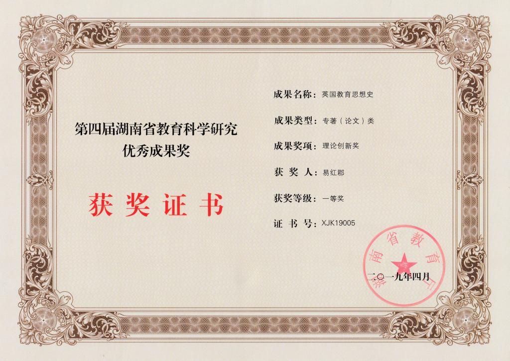 2019年4月,湖南省教育厅下发《关于公布第四届湖南省教育科学研究优秀成果奖获奖名单的通知》,我校6项研究成果荣获该奖。本次评奖按成果价值分类设立理论创新奖、决策咨询奖、实践探索奖,我院易红郡教授的学术专著《英国教育思想史》获评理论创新类一等奖。