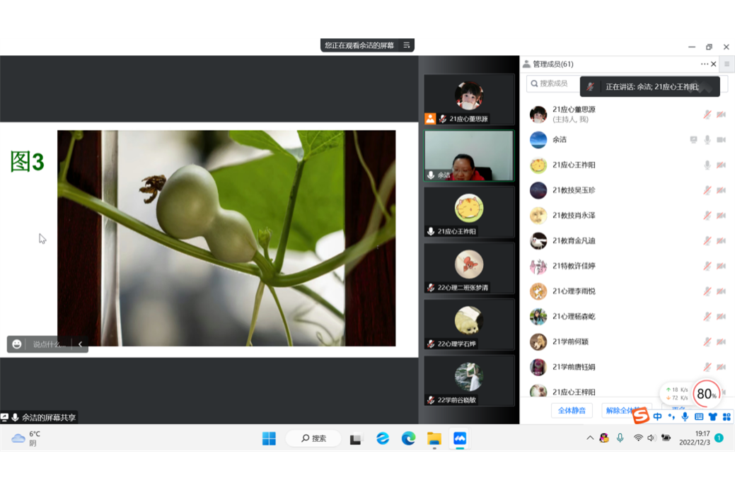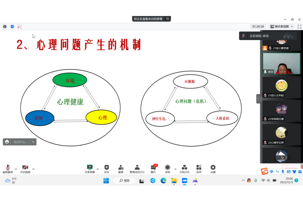余洁介绍了校心理健康教育工作的基本概况,她表示学校把学生心理健康工作摆在突出位置,并希望学院积极开展心理健康教育系列活动。此外,她通过列举事例深入浅出地讲解了关注同学们心理状况的必要性与重要性,介绍了心理疾病形成的原因与过程,教授了预防心理问题的相关方法。她表达了对朋辅们的殷切期望,希望他们能在守护心理健康的这条路上走得更稳更远。
