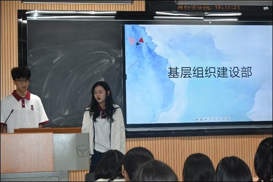 晚七点,宣讲会正式开始。系统宣讲顺序依次是团委、学生会、青年传媒中心、学社管。各位负责人将部门特点与文本内容、剪辑视频、才艺表演等多种宣传形式相结合,向2023级本科生详细介绍了各学生组织的具体职能、招新概况、招新人数等内容,为有参与意向的学生提供了解渠道,明确招募要求,使其更全面、更系统地认识了两会两中心。