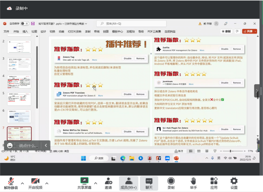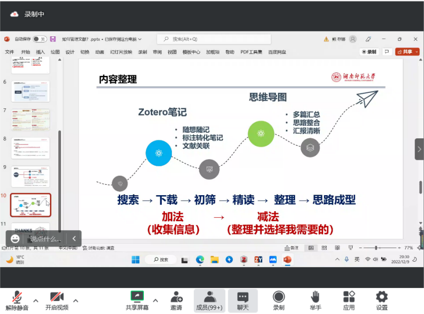熊存娜围绕“如何管理文献”主题,从“文献的下载”“文献的整理”“文献的阅读”“内容整理”四个方面分别展开论述,并从介绍文献下载数据库切入,配合讲解文献管理的推荐插件。同时向同学们详细阐述了文档管理的优缺点,强调文档管理的重要性。熊存娜还运用自身总结的文献阅读技巧,以心理学为例,向大家详细的展示了如何查找文献并且快速阅读文献,以此来确定目标文献。最后在内容整理部分,向大家传授了如何运用zotero笔记以及如何完成系统思维导图,完整讲解了管理文献全过程。