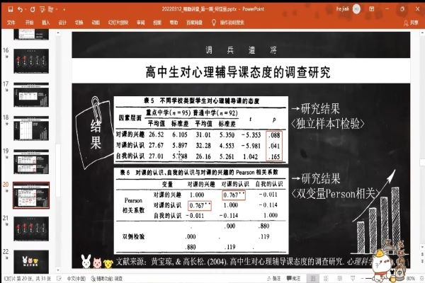 何佳丽以“如何开展调研活动”为主题,围绕前言、方法、结果、讨论、结论五个层次分别展开论述,并结合高中生对心理健康课的态度为例,将调研比喻成没有硝烟的战争。前言部分,她以“征战何方”点出高中生在学科、性别、学校等方面的差异,并指出调研首先应区分对象在不同维度上的特征;以“师出有名”引出是什么,为什么,怎么做的研究程序,以此凸显调研的价值。方法和结果部分,她以“调兵遣将”指明数据收集、数据分析的重要性以及研究工具描述的指向性和研究结果的相关性。讨论部分,她以“点兵聚将”对既定的调研结果进行深入探讨,逐步分析调研结果与实验假设的合理性。结论部分,她以“班师回朝”明确调研的最终结论,如“不同性别喜好不同学科的学生对心理辅导课的看法不存在显著相关”。在讲堂的自由提问环节,何佳丽耐心解答同学们提出的疑问,并积极鼓励同学们尝试调研。