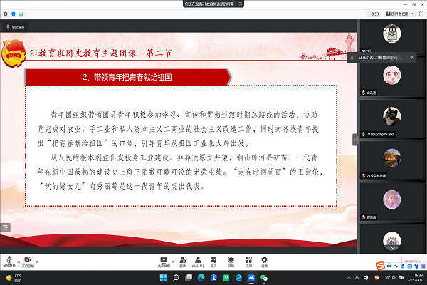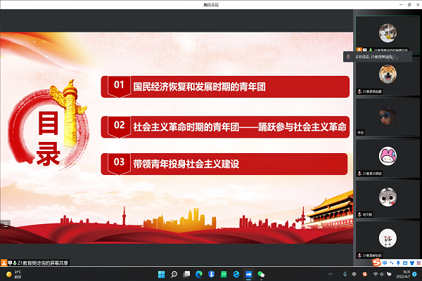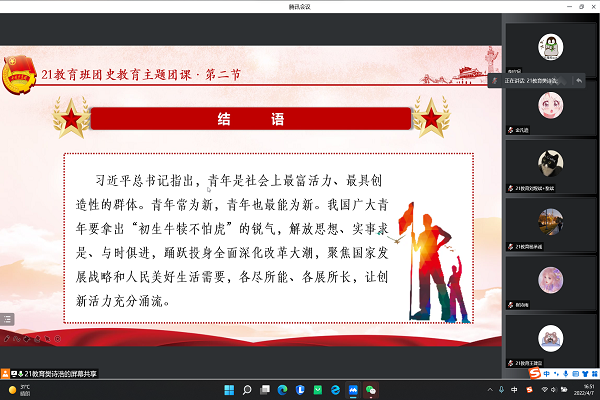 (通讯员 樊诗浩)4月7日下午,教育科学学院21级教育班团支部在腾讯线上会议平台上进行了主题为“社会主义革命和社会主义建设时期的中国共青团”的团史教育主题团课。21教育班团支部全体团员、青年参加本节团课,团课由团支部书记樊诗浩与第一团小组组长侯思宇两位同学担任主讲人。