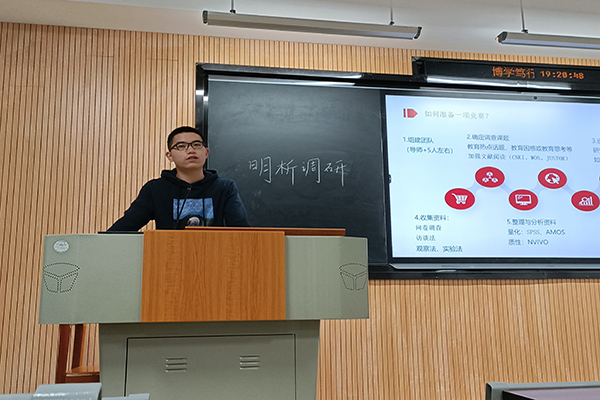 (通讯员 李佳 许晏嘉 曾文巧)11月25日晚,教育科学学院团委青发部励行团校在教科院315教室举行“明析调研 筑梦起航”宣讲会。此次会议由18级教育学杨春明主讲。教科院部分本科生参加会议。