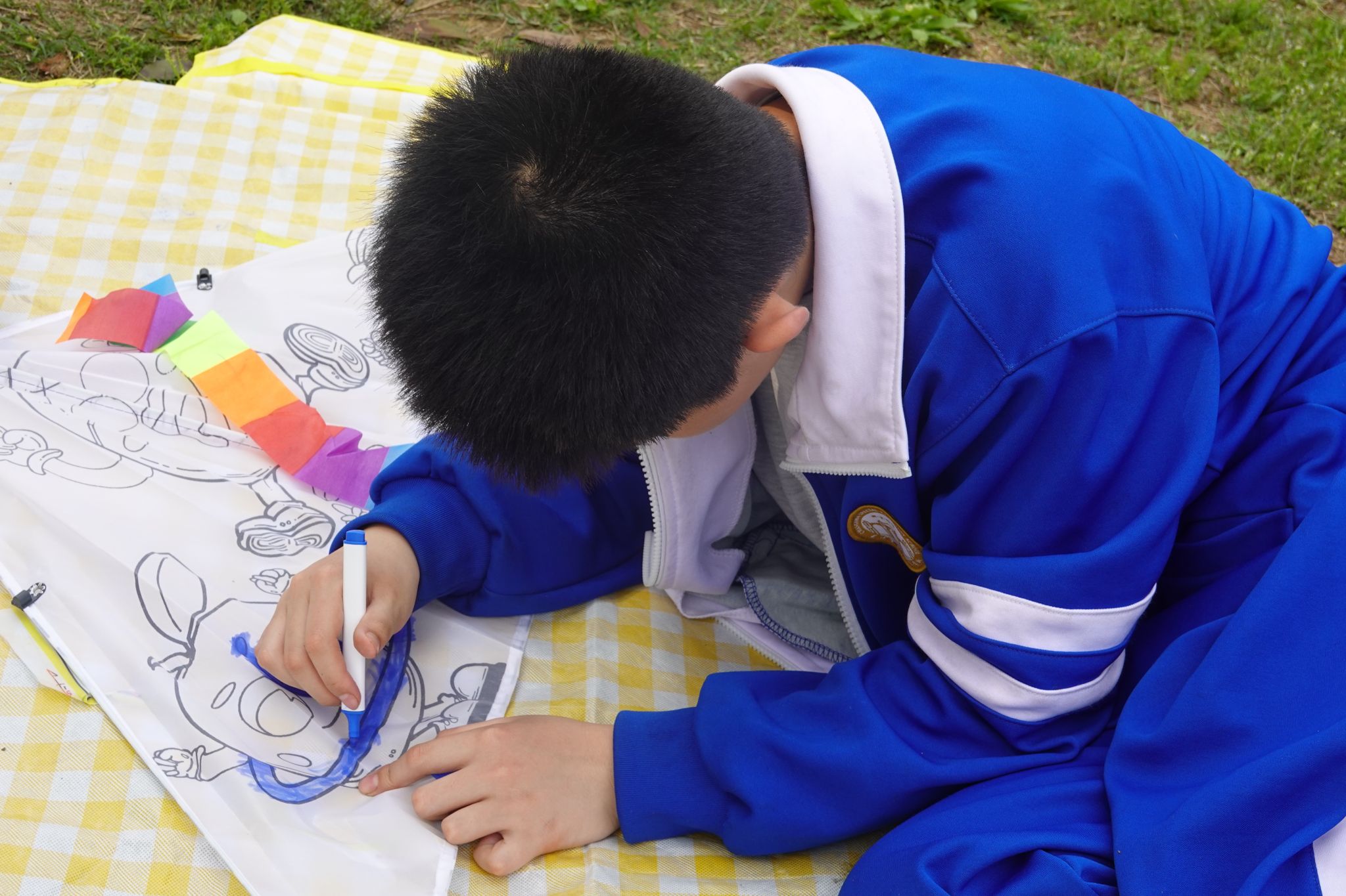在学校集合完毕后,实习队队员屈清华、向心雨和学校教师们带领学生前往公交车站候车,由学生自主完成排队候车、自主投币等实践环节。学生们全程保持车厢安静,展现出了良好的公共交通素养。进入玉湖公园后,学生们拿出任务单,并在实习队队员的协助下展开任务挑战,他们需要在公园内找到课堂中学过的樱花、桃花、樟树等植物并在任务单上打勾。在风筝创作环节,学生们用水彩笔在空白风筝上描绘春日图景,有的用蓝色涂抹出心中的天空,有的以粉色画出朵朵盛开的小花。完成创作后,实习队队员带领学生分组放飞风筝,在奔跑中感受春风。活动最后,实习队队员与特校教师组织学生围坐进行野餐,学生们互相分享食物,共享春日美好。