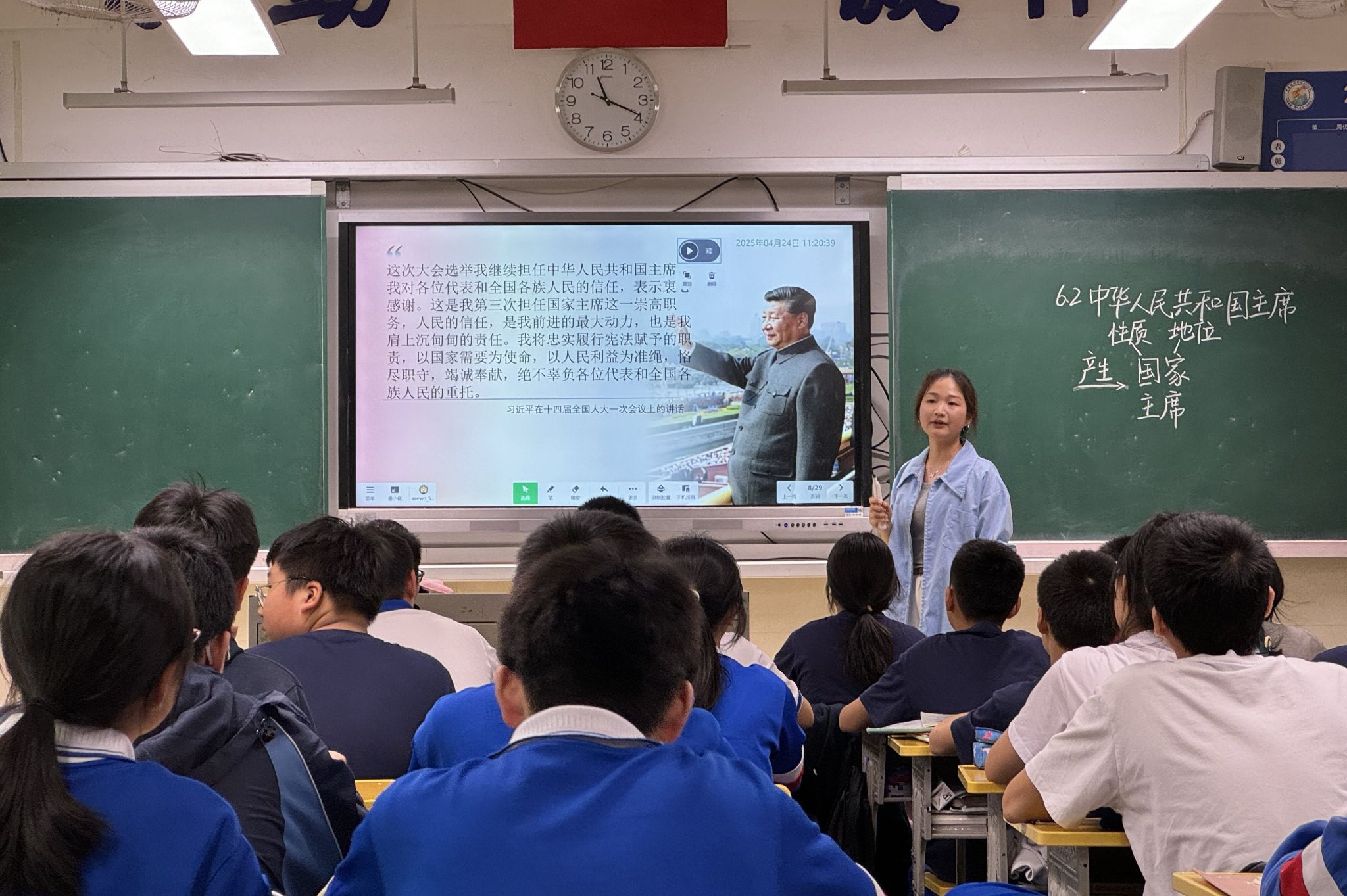 课堂伊始,邹世丹以习近平主席成长过程中的一系列图片为切入点,巧妙地引出“国家主席”这一话题。她以宪法为纲领,详细阐述了国家主席的性质、地位、产生方式、候选条件和任期,并对主席的任免权与外事权进行辨析。为巩固学习效果,邹世丹运用智慧课件,设计趣味分类小游戏,极大激发了学生的学习兴趣。评课环节,李新指出需设计更具有挑战性的问题链,促进学生的高阶思维发展,并加强课堂纪律管理。同时,她鼓励融入习主席扎根基层的视频素材,以强化强国建设的目标引领,实现情感共鸣。陆小波则对邹世丹的首次授课给予了肯定,并建议适当精简教学内容、充分利用麦克风等教学辅助工具。