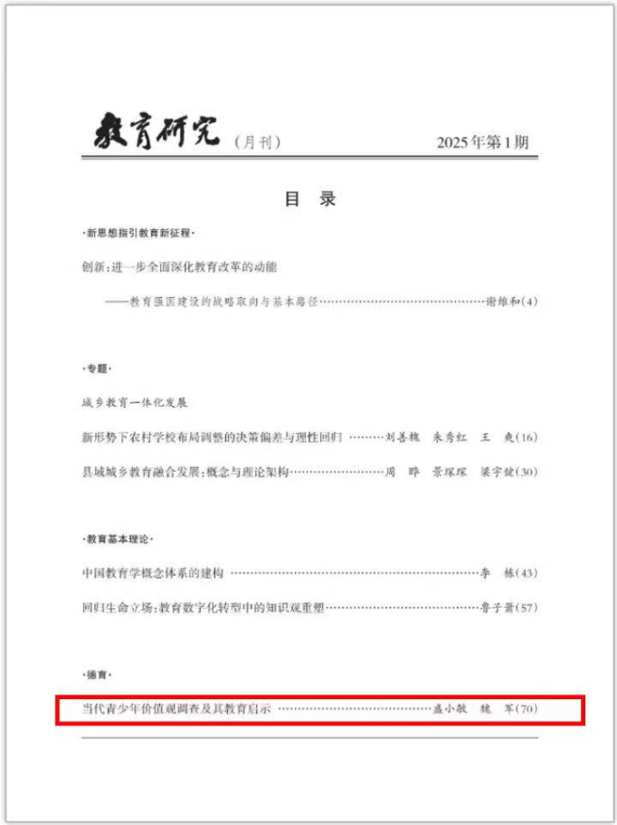 近日,我院青年教师盛小敏作为第一作者及通讯作者在《教育研究》期刊发表了题为《当代青少年价值观调查及其教育启示》的文章,湖南师范大学为该论文的第一作者单位及通讯单位。