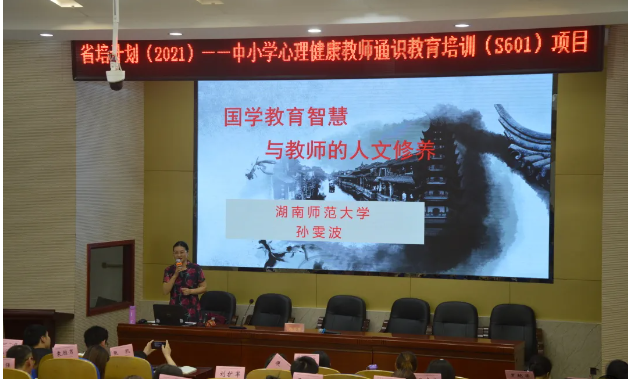湖南师范大学公共管理学院副教授孙雯波主讲《国学的教育智慧与教师的人文修养提升》,以论语为代表的国学经典中,蕴含着往哲先贤对为师之道的独特见解,更隐藏着破解今天教育难题的密码,孙教授生动阐述了国学中蕴藏的教育智慧,细致分析了心理教师如何研究国学经典,提升教师人文素养。