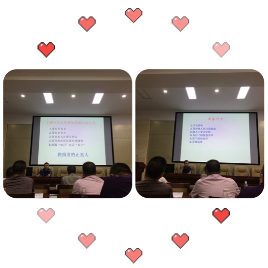 7月24号下午,湖南省中小学教师发展中心“师德师风建设与名师工作科”科长龚明斌老师给乡村校园长及教师讲解了中小学师德建设的问题与对策。在此次讲座中,龚老师首先就阐明了师德建设的意义,并由当前师德存在的问题展开到加强师德的基本举措,最后总结乡村教师配享幸福的教育人生应该怎么做,例如要有目标和追求,经常保持微笑,学会和别人分享喜悦,学会跟各种人愉快的相处等等。在讲座期间,龚老师的分享的那些感人的教师案例,一次次让各校园长为之动容,似乎找到自己内心的声音。