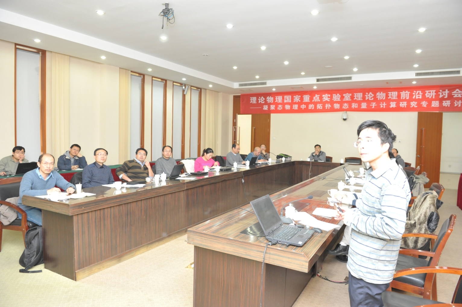 由理论物理国家重点实验室资助的“理论物理前沿研讨会—凝聚态物理中的拓扑物态和量子计算研究专题研讨”于2011年11月25日至27日在北京郁金香温泉花园度假村顺利召开。此次会议主要邀请了来自于北京大学、北京师范大学、中国人民大学、北京科技大学、中国科学院研究生院、北京计算科学研究中心、中国科学院物理研究所、北京应用物理与计算数学研究所和中国科学院理论物理研究所等国内知名单位二十余位活跃的相关领域专家参与。