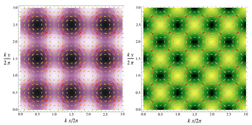 左图和右图分别给出了从全息模型得到的棋盘格状的超导凝聚和电荷密度的空间调制,其中箭头代表自发流密度的分布。
