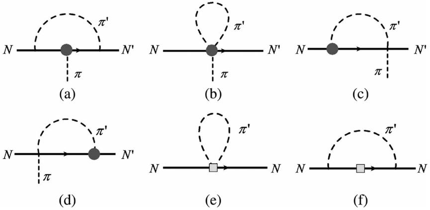 的单圈修正费曼图;(e,f) 质子-中子质量劈裂的单圈修正费曼图