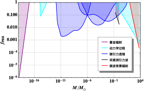 图1 原初黑洞的观测限制。横轴为原初黑洞质量(以太阳质量为单位),纵轴为原初黑洞的能量密度(以暗物质的能量密度为单位)。紫色为霍金辐射导致黑洞蒸发的限制。天蓝色三角形为白矮星俘获原初黑洞的限制。蓝色为微引力透镜的限制,从左到右分别为Subaru HSC,EROS,OGLE。黑灰色梯形为LIGO第二期运行时得到的双黑洞引力波限制。右方天蓝色为矮星系俘获原初黑洞的限制。红色为微波背景辐射的限制。由于波动光学效应和有限尺度效应,1017克到1022克的质量区间的原初黑洞不能产生微引力透镜,因此无法通过光学手段观测。原初黑洞有可能在这个质量区间提供全部暗物质。对该窗口的唯一可能的观测限制来自于未来的空间引力波实验。