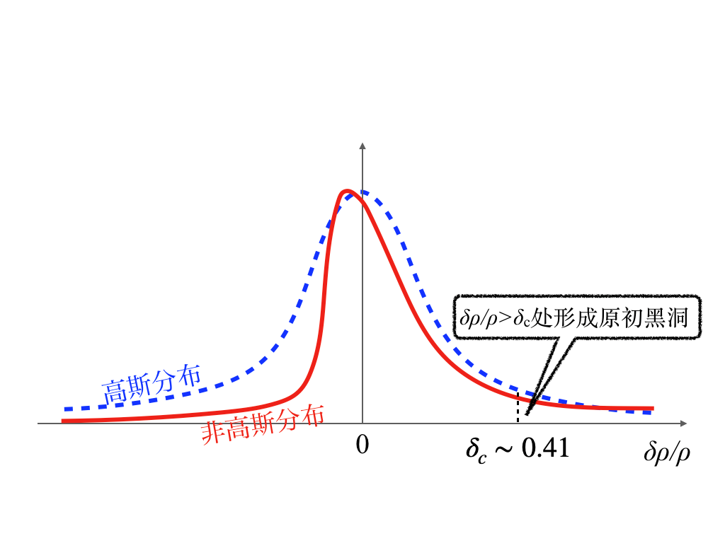 图2 原初密度扰动δρ/ρ的概率密度分布函数的示意图。δρ/ρ>δc的宇宙即可形成原初黑洞。相对于高斯分布来说,非高斯分布的大于δc的尾巴部分面积更大,可形成更多原初黑洞。在非高斯涨落情况下,同样数目的原初黑洞只需要更窄(即功率谱更小)的原初密度扰动即可产生。