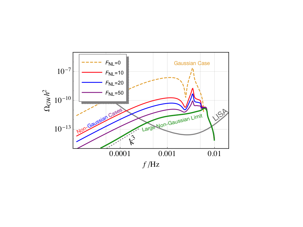 图3 暗物质全部由原初黑洞组成的情况下,原初标量扰动产生的诱导引力波。原初黑洞的质量取定为1022克,对应诱导引力波频率0.003赫兹。橙色虚曲线为高斯型的标量扰动诱导的引力波。红、蓝、紫曲线为不同的非高斯性的情况。苔绿色为极端非高斯(χ^2分布)的标量扰动诱导的引力波。可以看到固定原初黑洞的能量密度的情况下,增大非高斯会压低诱导引力波。但其能量密度的下界在下一代空间引力波探测器LISA/太极/天琴的敏感度曲线以上。
