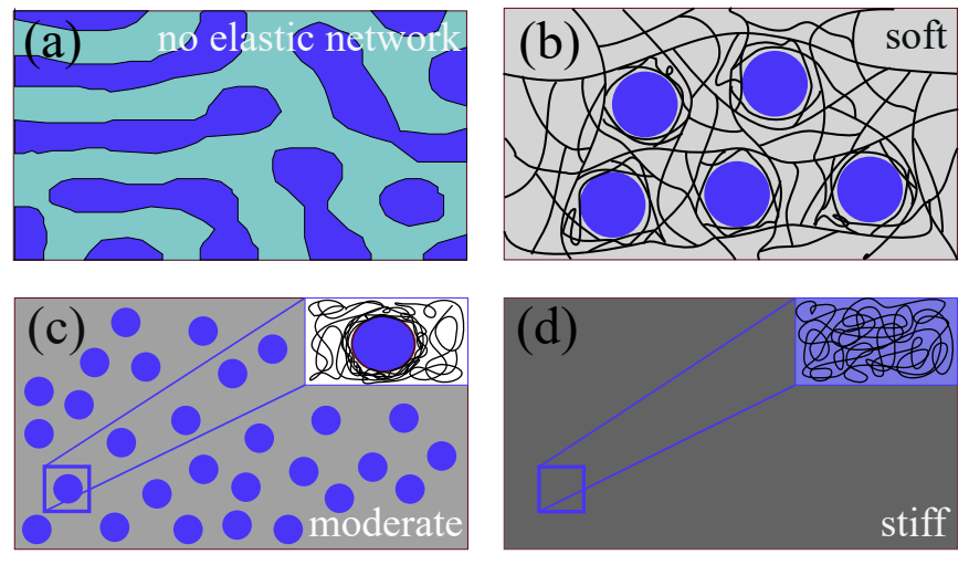 图一:(a)无弹性网络时液-液相分离形成的结构。(b)软弹性网络中形成的尺寸较大的液滴。(c)中等硬度的弹性网络中形成的数密度较大的小尺寸液滴。(d)硬弹性网络会抑制液-液相分离,导致无液滴产生。