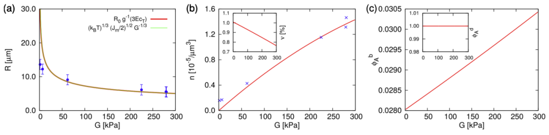 图二:理论数值与实验结果对比。(a)液滴尺寸随着弹性网络剪切模量的增大而减小。(b)液滴数密度随着弹性网络剪切模量的增加而增加。(c)稀相溶质的体积分数随剪切模量增大近似线性增加。