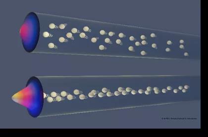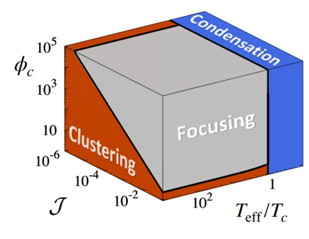 近日,中国科学院理论物理研究所孟凡龙副研究员同德国马克思普朗克自组织研究所Ramin Golestanian教授和Benoit Mahault博士,以及日本大阪大学Daiki Matsunaga助理教授合作,利用构建解析理论和朗之万动力学模拟的方法,发现微流管道内的磁性微观游泳体可以呈现奇异的类似于量子系统中玻色-爱因斯坦凝聚形式的集体运动模式。通过定义系统有效温度(依赖于系统实际温度,游泳体尺寸,游泳体活性以及外部磁场强度等),他们发现当系统有效温度低于某临界值 Tc 时,游泳体在管道内的径向分布有两部分组成:(1)Lambert W函数形式的连续型分布,和(2)管道的径向中心处δ函数型分布。而符合δ函数型分布的游泳体比例(凝聚比例)符合玻色-爱因斯坦凝聚形式,φ ~ 1 - Teff/Tc,同时系统内能和压强等热力学量也呈现和玻色-爱因斯坦凝聚类似的标度形式。另外,他们提供了此系统中磁性微观游泳体可呈现的集体行为模式的相图(径向聚集,轴向成团和径向凝聚)。