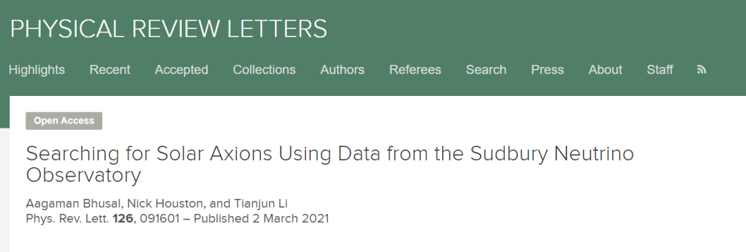 中国科学院理论物理研究所李田军研究员, 北京工业大学理学部国际教师Nick Houston博士,以及中国科学院理论物理研究所博士研究生Aagaman Bhusal 同学创新性提出了利用SNO 实验结果开展轻型暗物质或长寿命粒子的探测研究,并首先于太阳轴子探测研究中取得进展。