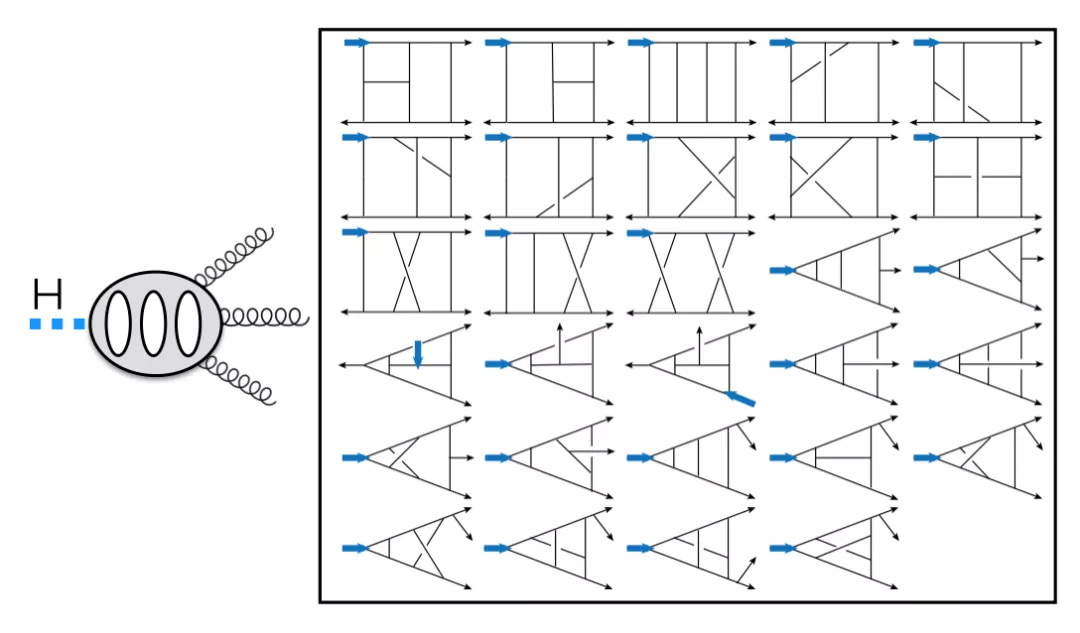 在这一课题中,作者考虑了一类超对称场论中的三圈三点形状因子,这类物理量可以类比于Higgs到三个胶子过程的散射振幅。两圈水平的研究表明这些超对称形状因子可以给出QCD结果中函数最复杂的最大超越函数部分 [5],所以和唯象学也有紧密的联系。以上述能动量守恒流算符相关的形状因子为例,图3表示了该形状因子的示意图以及所涉及的29个费曼图。