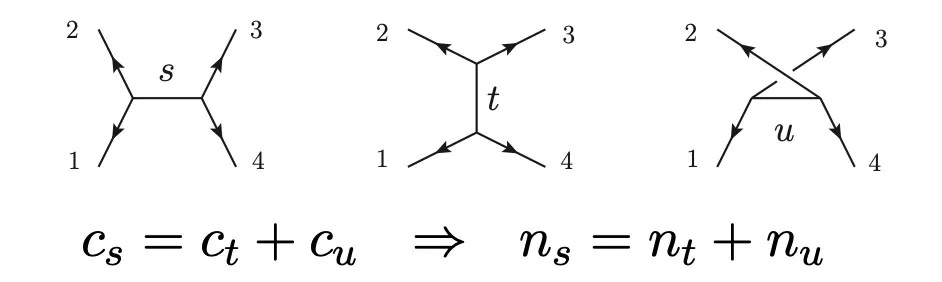 图1:四胶子振幅可以用s、t、u三个图表示,其动量因子n满足和色因子c相同的代数关系。