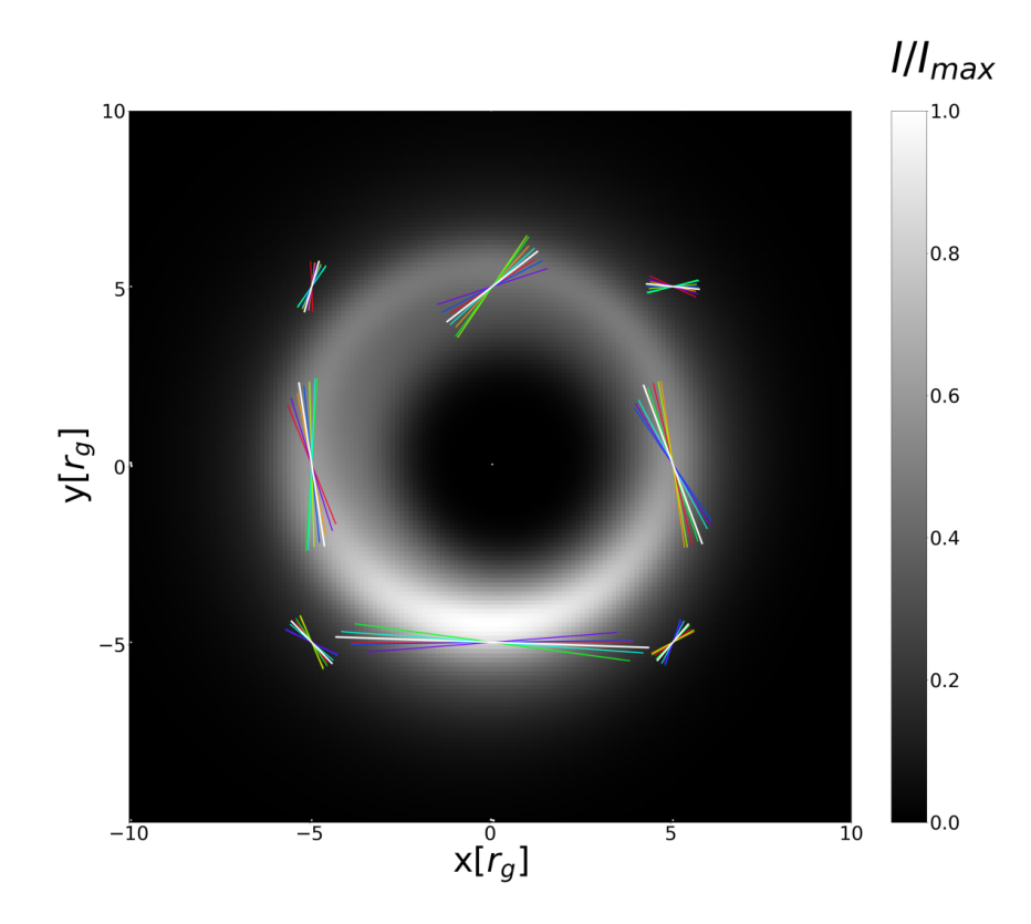 被轴子云包围的克尔黑洞的线偏振辐射图。电矢量位置角(EVPA)用不同颜色的线表示,白色线是轴子场不存在时的EVPA,彩虹色线(从红到紫)表示一个周期内等时间间隔线偏振光投影方向角的变化。整体辐射强度由黑白表示并被归一化。