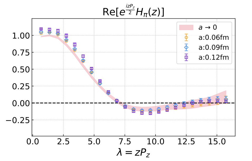 LPC合作组基于研究[2]的数值结果,提出了使用多个格距的强子矩阵元,拟合重求和后的线性发散系数的“自重整化”方案[3],并应用于赝标介子的LCDA精确计算中[4]。如图2所示,自重整化方案能够完全消除准-LCDA矩阵元中来自Wilson线的紫外发散,从而可以安全地得到连续极限。进一步对这些矩阵元应用大动量有效理论的解析计算以修正其紫外发散行为,就可以得到图3所示的LCDA理论预言。同时,研究[4]也发现:1)相比之前LPC合作组对矢量介子LCDA的研究[5]中所使用的混合重整化方案,“自重整化”方案虽然在目前所使用的格距上没有高于系统误差的差异,但可以避免在更小的格距进行计算时出现剩余紫外发散;2)使用SMOM或者IMOM等在算符处有动量转移的RI/MOM衍生方案,也不能避免RI/MOM方案中的剩余紫外发散。研究论文已于近日发表在Phys. Rev. Lett.[4]。