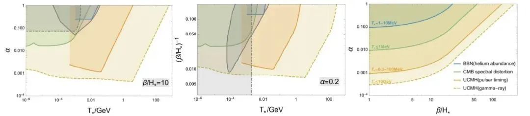 图1:对曲率扰动的不同观测实验对相变参数空间的限制,其中α代表相变的强度,β/H-*代表相变的速率,T*为相变的温度。左图和中图里灰色实线和灰色点虚线为通过引力波和原初核合成对相变参数空间的限制。