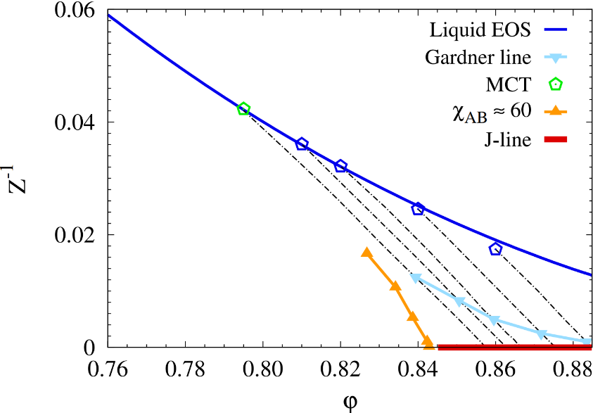 玻璃相图:自上而下,在增大压强趋于阻塞态(红线)的过程中,系统总是先经历Gardner转变(橘线与浅蓝线)。临界阻塞因此受Gardner物理控制。