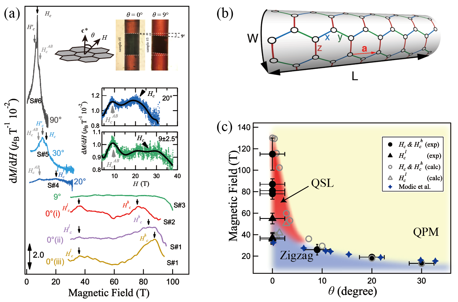 图1 (a)转角度高磁场磁化测量结果(b)理论计算所采用的二维六角晶格圆柱面结构(c)实验测量高场转角相图并与理论对照。
