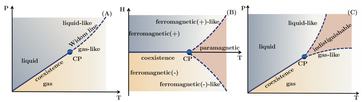 图1 超临界相转变线的示意相图。(A) 气液体系(P-T)相图,Widom 线(虚线)将临界点(CP)上方的类液相和类气相区域分隔开来。(B) 伊辛模型(H-T)相图,两条超临界相转变线(虚线)分别在外磁场的正侧和负侧,将类铁磁相 (+)、顺磁相和类铁磁相(-) 分隔开来。(C) 含两条超临界相转变线(虚线)的气液相图,将超临界区分为类液相、气液不可分辨相和类气相。
