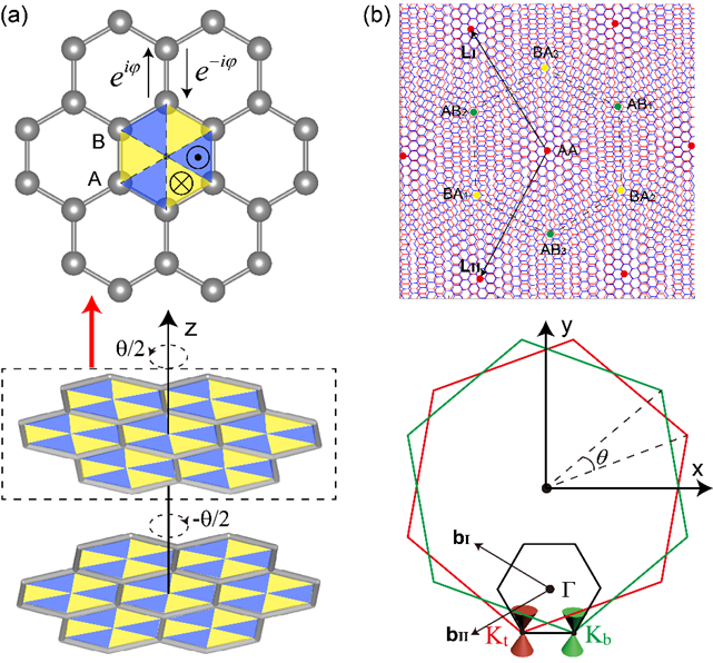 图1:转角双层体系模型示意图。(a)单层具有交错磁通的蜂窝格子;(b)转角双层体系莫尔超晶格和布里渊区。