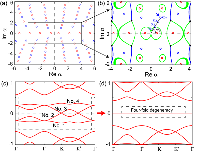 最近,中国科学院理论物理研究所吴贤新副研究员与日本理化学研究所Ching-Kai Chiu研究员、勒聪聪博士合作,发现通过在单层蜂窝格子中引入周期性交变磁通,转角双层体系可以实现四重(每个谷/自旋)简并的莫尔平带;进一步地,他们通过构造波函数的方法证实这些能带是没有色散的绝对平带。首先,他们建立了具有交变磁通转角双层体系的有效模型(图1),并通过一个规范变化发现交变磁通会导致层间耦合获得磁相位而变成复数。接着,他们计算了手性极限下模型的Birman-Schwinger 算符能谱[5](如图2),发现在复平面上除了实轴上单重实本征值(普通魔角)外,还有交替出现的单重(红色圆圈,图2)和二重复本征值(蓝色圆圈,图2)。由于层间耦合为复数,能谱复平面上本征值就可以通过调节转角和磁通来实现。他们的计算表明单重复本征值对应着体系的二重平带,而二重复本征值则对应着体系的四重平带。四重平带的实现源于