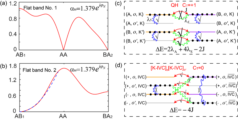图3:四重平带位于K/K'点波函数实空间分布(a,b)和典型的电子关联态(c,d)。