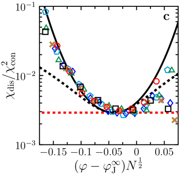本研究表明,在零温和准静态加载的情况下,jamming相变是一种无序一阶相变。在 jamming相变中,涨落-耗散关系并不满足涨落量χdis和响应量χcon之间不相等,而满足平方关系(图1)——后者是无序一阶相变的典型特征,其原因是体系的涨落主要由无序主导,热涨落效应则可以忽略。除了jamming相变,随机场伊辛模型的一阶相变、非晶固体脆性屈服、超稳玻璃融化等无序体系的相变也属于无序一阶相变。