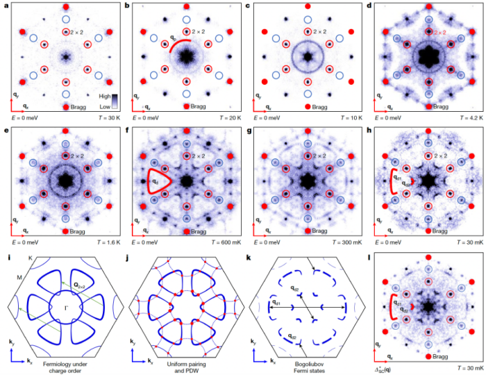 最近,中国科学院理论物理研究所吴贤新副研究员和周森研究员与南方科技大学殷嘉鑫教授实验团队合作紧密合作,通过研究笼目超导体极低温实空间超导能隙振荡,发现了手性配对密度波态的残余费米弧。实验团队利用扫描隧道显微镜测量 和 笼目超导体,发现超导能隙振荡周期是 (图1a-c),且在动量空间中 的三组散射峰强度不同,由弱到强的旋转方向可以定义出超导能隙振荡的手性(图2a-c)。通过实验发现,超导能隙振荡的手性可以被施加的外磁场所调控。研究团队进一步用超导针尖实现了超导约瑟夫森隧道结来探测局域配对电子密度,并观测配对电子密度为 的手性振荡(图1d-e,图2d-f)。这些结果证实笼目超导体本征的手性配对密度波态的周期是 ,与体态电荷序周期吻合,厘清了学术界在配对密度波波矢上的争议。进一步,研究团队测量了不同温度下的准粒子散射谱,发现随着温度降低费米面会逐渐消失并演化成费米弧,且在远低于超导转变的温度下,系统依然具有明显的费米弧(图3),这些是波戈留波夫费米面存在的证据。研究团队利用唯象分析和理论计算发现实验结果与电荷序和轨道选择配对之间的相互作用有关,并提出一种可能物理机制:空间均匀的超导主要发生在Sb的p轨道上,而非V的d轨道,主要原因是V-d轨道费米面的大部分已被电荷序打开能隙;进入超导态后,Sb-p轨道上的超导和V-d轨道的手性电荷振荡进行耦合,形成了一种特殊的p-d轨道混合的手性配对密度波,从而产生波戈留波夫费米弧(图3 i-k)。研究团队的实验观测和理论分析为有限动量配对的配对密度波态提供了完整的证据链。