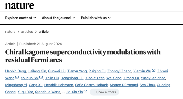 研究成果于2024年8月21日在《自然》杂志在线发表。该工作的实验测量由南科大殷嘉鑫课题组完成,中国科学院物理研究所石友国课题组和北京理工大学王秩伟课题组为该项目提供了高质量的单晶。该工作的理论部分主要由理论物理所吴贤新副研究员、周森研究员和博士生傅瑞庆共同完成,其中傅瑞庆同学做了详尽的数值计算。南科大邓翰宾博士,粤港澳量子中心秦海浪,南科大刘国威、杨天宇和理论物理所博士生傅瑞庆为共同第一作者。吴贤新副研究员、石友国研究员、王秩伟教授和殷嘉鑫副教授为共同通信作者。该项工作的其他合作者还包括香港科技大学张中义博士以及德国、瑞士科学家团队。本工作得到了国家重点研发计划青年项目、国家自然科学基金、中国科学院相关项目的支持。