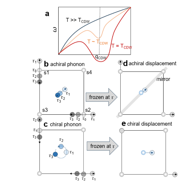 图1 (a)声子在温度降低当临界点( )时声子发生软化;(b)若该声子不是手性声子,其振动模式不会破坏镜面,以及中心对称性,对应于非手性CDW态(d);(c)若该声子是手性声子,其振动模式破坏了镜面,以及中心对称性,对应于手性CDW态(e)。